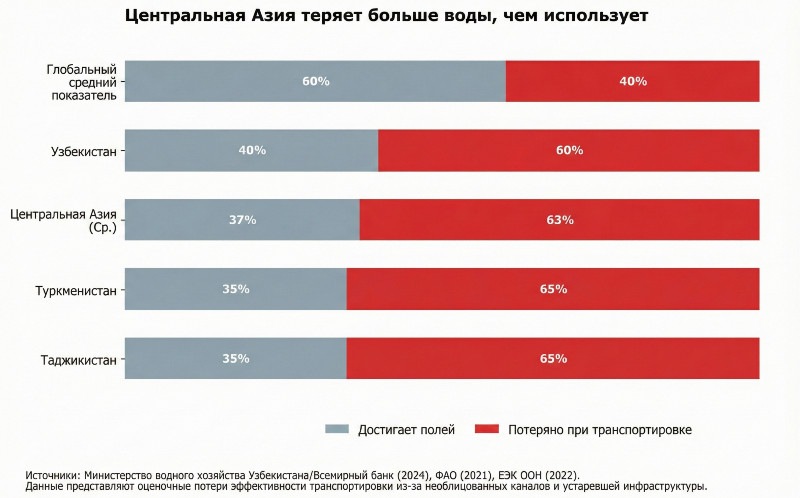 The problem is aggravated by the condition of the Pamir and Tien Shan glaciers, which feed the Amu Darya and Syr Darya rivers. These mountain systems are warming significantly faster than the global average, and glaciers have already lost a significant portion of their mass since the 1960s. Despite the reduction of resources, the region continues to consume water with enormous inefficiency. Agriculture, which accounts for up to 90 percent of water intake, relies on outdated irrigation systems with open channels, where losses on filtration and evaporation reach 40 percent even before water reaches the fields.