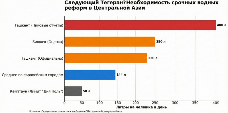 The city’s infrastructure is also in critical condition. Tashkent, Bishkek, Almaty, Astana and Dushanbe look more prosperous than they really are. A significant part of the water supply networks dates back to the Soviet era and is maintained through emergency repairs, rather than system replacement. Water losses in the networks reach 40-70 percent. At the same time, water consumption in the capitals of Central Asia is many times higher than in Western countries where sustainable development standards apply. For example, in Tashkent, peak consumption reaches 400 liters per person per day, while in European cities this figure averages 144 liters. Unrealistic tariffs that do not cover the cost of network maintenance and the lack of metering devices only exacerbate the problem.