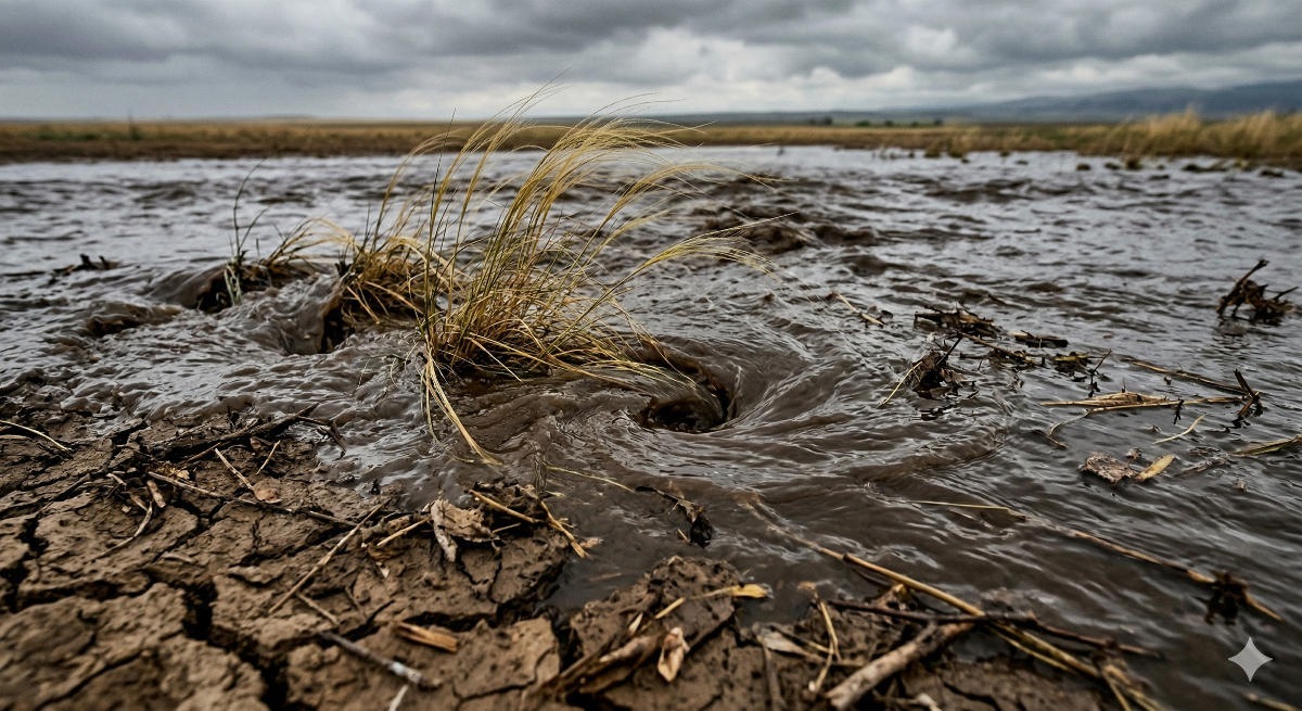 Vehicle traffic has not been suspended, and the road surface remains undamaged. The water continues to spread across the fields, creating new waterlogged zones. Local ecologists and agronomists have yet to assess the extent of soil erosion at the breach site and the overall damage caused by the sudden inundation of fertile lands.